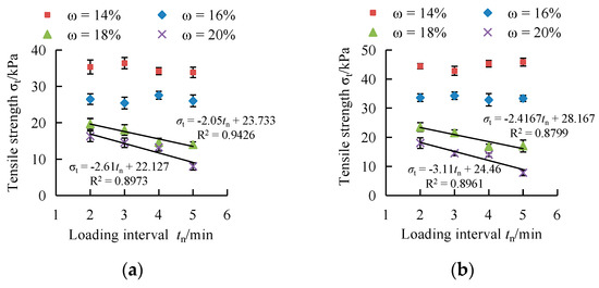 Effect of loading interval on tensile strength: (a) ρd = 1.37 g/cm3; (b) ρd = 1.46 g/cm3.