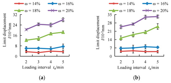 Effect of loading interval on limit displacement: (a) ρd = 1.37 g/cm3; (b) ρd = 1.46 g/cm3.