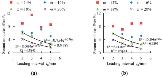 In order to obtain the essential attributes of loess that do not depend on the size of the sample or the specific experimental device, the data were processed to obtain the variations of the average stiffness of the samples to various water contents and loading intervals (Figure 11). The secant modulus was calculated based on the tensile strength and maximum tensile strain recorded for each test. The strain was determined by assuming an influence area of approximately two times the length of the fracture zone. The assumption was based on the results from the deformation analysis presented in the next section. The secant modulus was plotted against the loading interval. It was found that when ω < PL, the tensile strength is not sensitive to the loading interval. However, when ω > PL, the secant modulus can be approximated by an exponential function: (2 ≤ tn ≤ 5). Where ES is the secant modulus, tn is the loading interval (tn = 2, 3, 4, 5 min), and α is the coefficient that relates to water content. α is given by α = ES(0), i.e., it represents the secant modulus under continuous loading. β is the coefficient given by . It indicates the relative reduction rate of the secant modulus. It is necessary to note that the above data can also be fitted with a linear relationship within the range of water content of the sample in this test. There is no doubt that the stiffness value of the specimen decreases gradually. Nevertheless, as the sample used in the test could not be fluid, it is not possible for the value to eventually become zero with the extension of the loading interval. Thus, in this paper, the exponential function was used to express this.