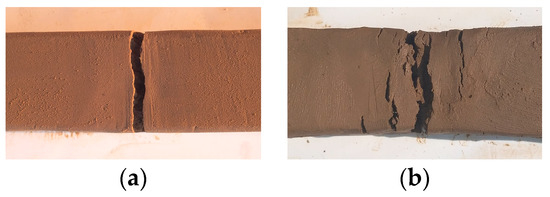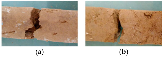 The qualitative evaluation results of axial deformations were investigated during the pull tests. The typical fracture patterns, generally speaking, could be divided into ‘transverse failure’ and ‘serrated failure’ and are shown in the photos in Figure 12 and Figure 13. For the transverse failure (Figure 12), the difference of ultimate displacement and deformation depended largely on the water content of the specimen. The plastic limit (PL = 17.6%) could be regarded as a reference point. When ω ≤ PL, only one main crack occurred at the central section of the specimen and was perpendicular to the axial direction during the progression of the test. The failure could be regarded as a brittle fracture as there was no breaking precursor and no practical necking phenomenon (Figure 12a). The axial displacement grew slowly with the application of loads, and the maximum failure displacement merely reached 8.5 × 10−2 mm. In contrast, when ω ≥ PL, the specimen in Figure 12b showed elastoplasticity. Besides the emergence of the main crack, numerous tiny cracks could be observed. With the increase of water content, slight necking could be observed. With the application of loads, the maximum failure displacement could reach 39.8 × 10−2 mm. It is worth noting that, based on the above deformation analysis, the unsuitability of the indirect tensile test method was proven when ω ≥ PL.