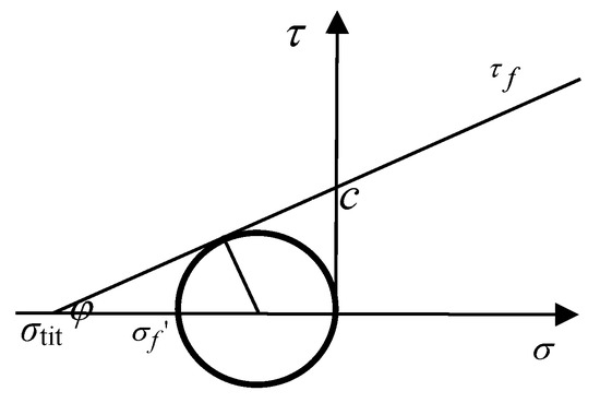 The pattern of serrated failure can be described on the failure Mohr stress circle shown in Figure 14. According to the Mohr-Coulomb (M-C) shear failure criterion, failure occurs not because the applied stress reaches the bonding strength, but because the ratio of shear stress to normal stress at a point reaches tan φ [35]. As the tensile test apparatus was not equipped with suction control or measurement devices, the total stress method was proposed to predict the tensile strength under this stress regime. The following equation can be derived from Figure 14
