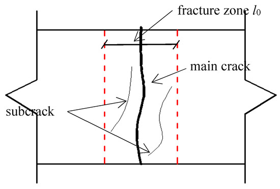 In the following constitutive equations study, we retained the definition of fracture zone l0 given by Hillerborg [42] and Labuz et al. [43], as shown in Figure 15. The length of fracture zone l0 was approximately measured by a vernier caliper after the test. It was discovered that the fracture zone l0 varies with water content rather than at a constant value. As shown in Figure 16, the exponential relationship between fracture zone l0 and water content was confirmed. The existence of the fracture zone indicates that the specimen was a nonuniform deformation, and the strain was mainly concentrated in the fracture zone. Thus, in this experiment, we have approximatively neglected the influence of the nonstrain zone, and the strain calculation was based on the fracture zone. To be conservative, 2l0 was approximatively considered to be the influence scope of strain.