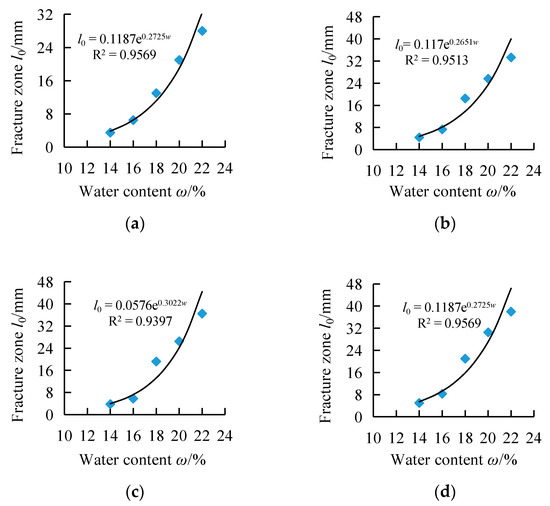 Length of fracture zone with water contents: (a) ρd = 1.28 g/cm3; (b) ρd = 1.37 g/cm3; (c) ρd = 1.46 g/cm3; (d) ρd = 1.53 g/cm3.