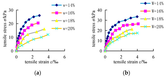 Figure 17 shows the tensile stress-strain curves with different water contents. Axial stress σ and strain ε were calculated separately by