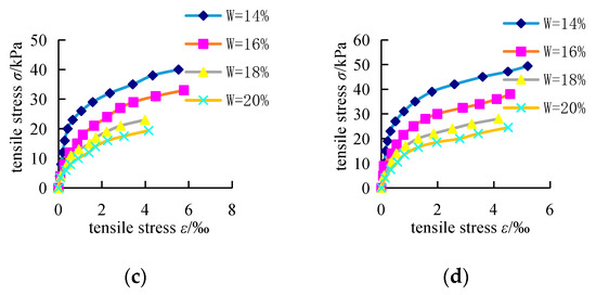 Tensile stress-strain curve of undisturbed soils: (a) ρd = 1.28 g/cm3; (b) ρd = 1.37 g/cm3; (c) ρd = 1.46 g/cm3; (d) ρd = 1.53 g/cm3.