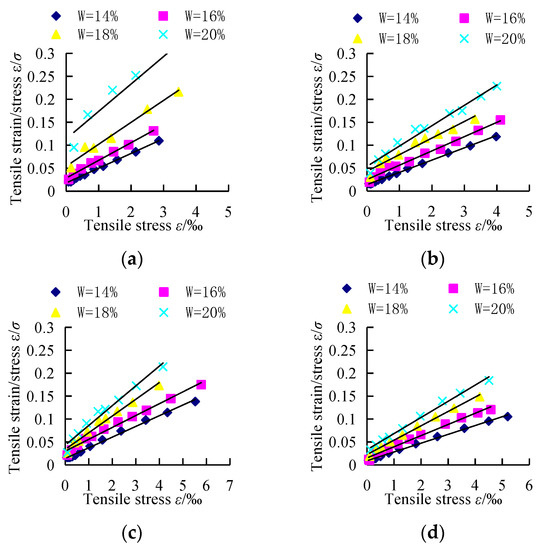 As seen in Figure 17, there was a general tendency for the curve to get closer to the strain axis when the water content improved, which was attributed to the generation of greater elastic-plastic deformation as a result of the increasing water content. All stress-strain curves had similar regularity. Based on the hyperbolic model describing soil mechanical characteristics by Duncan et al. (1970) [36] and Wang (1992) [44], a hyperbolic equation was used to describe the stress-strain relationship of soil under uniaxial tension, namely,