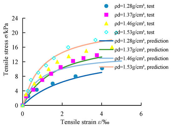 To verify the rationality of the hyperbolic function, the measured tensile stress-strain curves of the specimen with ω = 22% were fitted using the proposed constitutive relation. As shown in Figure 19, the fitted curves reproduced the test results well, which demonstrated that the proposed constitutive relations (13) could reasonably represent the tensile failure characteristics of undisturbed soils under uniaxial tension.
