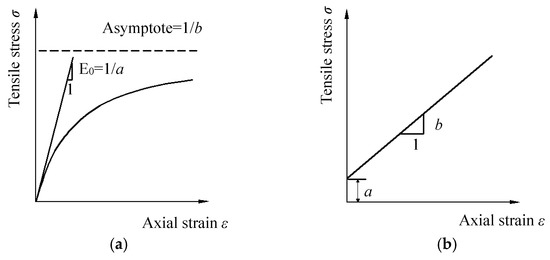 Physical meaning of parameters a and b: (a) hyperbolic stress-strain curve; (b) transformed hyperbolic stress-strain.