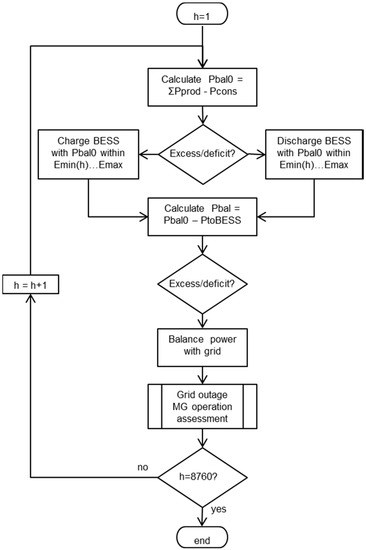 The microgrid options, by varying different parameters and assumptions used, could be assessed for the duration of power supply adequacy over the whole year, for each hour of the year. Section 3.1 and the flowchart in Figure 1 present the calculations for the normal states and thus the initial situations for the microgrid islanded operation for each hour of the year. The flowchart in Figure 2 presents the calculation procedure (“Grid outage microgrid (MG) operation assessment” subprocedure in Figure 1 flowchart) for the assessment of the microgrid islanded-mode operation and electricity supply adequacy for each respective hour.