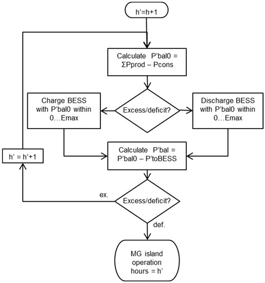 The procedure used in the MATLAB script for calculating the hourly power balance and power supply adequacy throughout the year in normal operation: h is the hour of the year in the simulation; Pbal0 is the power balance of production and consumption; ∑Pprod is the sum of hourly production; Pcons is the hourly consumption; “excess/deficit” refers to hourly power excess or deficit when considering power production and consumption; Emin and Emax refer to battery energy storage system (BESS) minimum and maximum charge; Pbal is the power balance after considering the discharging/charging of the BESS if possible; PtoBESS represents the electricity stored in the BESS at the hour in question; MG refers to microgrid.