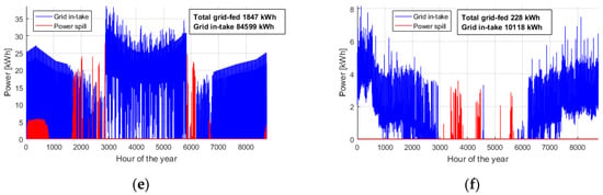 With the specified and adjusted assumptions and data, the microgrid electricity consumption and electricity production hourly data curves for the whole year are presented in Figure 3a, the BESS charging level is presented in Figure 3c, and the power feed to and intake from the network are presented in Figure 3e for the farm case. The corresponding data for the detached-house case are presented in Figure 3b,d,f, respectively. The total consumption and power production of the case-study microgrids are presented in Table 1.