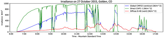 Measured GHI (blue), DNI (green), and DHI (red) in units of W/m for 27 October 2015 versus Mountain Standard Time in hours. The ramp event displayed in Figure 2 is seen in the DNI oscillations that occur around noon.