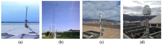 The UTSA SkyImager deployed at: (a) the ESIF building at the National Renewable Energy Laboratory (NREL); (b) the microgrid at the Joint Base San Antonio; (c) Tenerife, Canary Islands; and (d) Caleta de Sebo, on La Grasiosa.