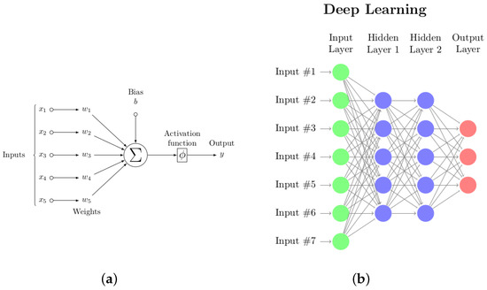 Artificial neural networks have evolved greatly since Rosenblatt proposed the perceptron, but the latter provides a good starting point for explaining today’s sophisticated Deep Learning (DL) architectures. In a simple feed-forward network, a vector of length m representing one example in a data set containing perhaps 100,000 samples (called examples) is input to the network. Figure 5a shows that a weighted sum of the inputs is then calculated, and an inner product is computed . This dot product becomes the argument to an “activation” function that serves as a threshold to determine when the neuron fires [15]. Many choices for are possible: the Heaviside step function, a linear function, or a sigmoid function such as . The goal of supervised learning is to find those weights that give the best agreement between the actual target classes and those predicted using the given weights. The optimization problem is often solved iteratively using gradient descent [16]. Effective on the binary classification problem, the approach can be expanded for multiple classes or the continuous output (regression) problem.
