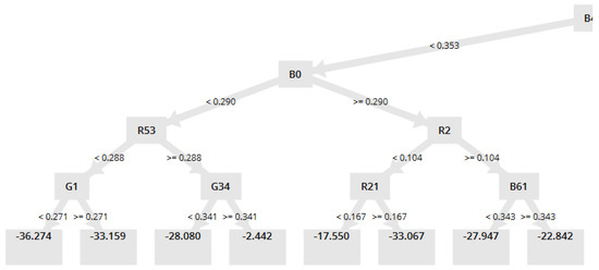 where f denotes a feature; and are the datasets of the parent and j-th child node, respectively; and and are the number of samples of the parent and j-th child node, respectively. In a binary decision tree, j is either or . Three common splitting criteria for the impurity measure I in Equation (5) are entropy, Gini impurity, and classification error. Decision trees can build complex boundaries in feature space, but care must be exercised to avoid overfitting of the data. Random forests [22] are an example of ensemble learning, which combines weak learners for robustness and strong learners to reduce overfitting and generalization error. The algorithm can be summarized as: (1) draw bootstrap sample of size n; (2) grow a decision tree from bootstrap sample; (3) repeat Steps (1) and (2) k times; and (4) aggregate prediction by each tree to assign class labels by majority vote. The Gradient Boosted Trees algorithm in RapidMiner uses stochastic gradient descent to improve the convergence properties of this random forests algorithm. Figure 6 shows part of the decision tree by this applied to the NREL dataset.