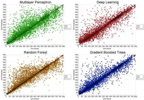 A standard way of showing how well random variables X and Y are correlated is with a scatter diagram. Scatterplot matrices display pair-wise correlations between different features in the dataset, but, in the case of images with RGB pixel values, the number of features renders this approach less valuable than it is with the Boston housing dataset, for instance. Figure 8 shows scatter diagrams of measured GHI versus predicted GHI for several different machine learning models: Multi-Layer Perceptron (MLP), Random Forest (RF), Deep Learning (DL), and Gradient Boosted Trees (GBT). A quick inspection shows that, while all four models perform well with tight clustering around the line (perfect correlation), there are differences. The DL and GBT models have fewer outliers and visually outperform the other two models, but a more quantitative assessment is needed.