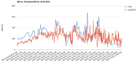 In this case, a second approach to displaying and understanding our results is a time series, in which predicted or measured GHI values are plotted on the y-axis as a function of time, plotted on the x-axis. Zooming in on one day of data, Figure 9 compares measured and predicted GHI for 3 October 2015. At this scale, there are differences mainly because this is an overcast day that makes prediction more difficult, but in overall trend the two curves track each other well.