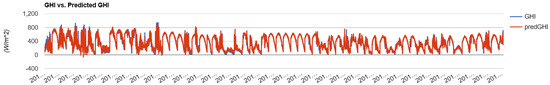 More illuminating is a time series graph of measured versus predicted GHI for the entire testing dataset, as shown in Figure 10. Once again, actual GHI is in blue and the forecast values are in red. Because the two curves track each other so closely, it is difficult at times to tell them apart. Both figures used the DL model to predict the target GHI values. In the middle of the graph, one can see a string of five consecutive clear sky days which are relatively easy to predict. In other places, overcast days are evident, and on moderately cloudy days the two curves differ most.