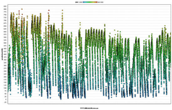 Rapidminer plot of the predicted GHI (W/m) as a function of time () using their Gradient Boosted Trees model for all days in the test dataset and the weights determined with the training data.