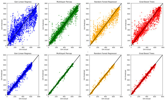 Scatterplots of GHI Actual (W/m) versus GHI Predicted for the four Machine Learning Models (General Linear Regression, Multi-Layer Perceptron, Random Forest Regressor, Gradient Boosted Trees) using pixel images on: the five Moderately Cloudy Days dataset (Top Row) and the five Clear Sky Days dataset (Bottom Row).
