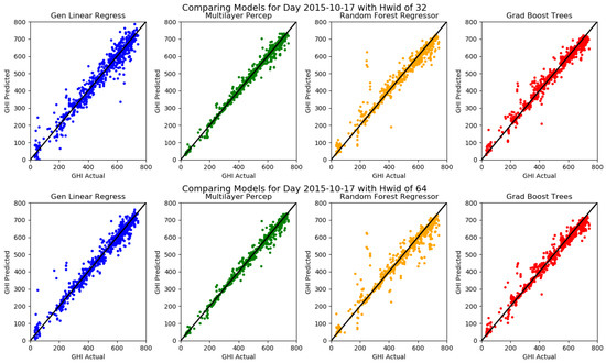 An interesting question arises: How much additional accuracy is obtained by using the finer sampled resized images at the expense of larger data file sizes and longer runtimes? Statistical sampling and information theory would suggest that, at some point, a law of diminishing returns will occur. To answer this question, Case Study 2 involves only one day of moderately cloudy observations taken on 17 October 2015, and running the four machine learning models with resized images of , , and pixel resolutions. Table 7 and Figure 13 show the results. First note that the size of the CSV data file used as input increases dramatically: 3, 111, and 442 MB, respectively. This strongly suggests a need for other input formats for the training and test data such as ubyte encoding or raw JPEGs, and ultimately the use of CNN. Runtimes also increase for all the models with MLP the most egregious: 139, 444, and 1309 s, respectively. Accuracies do improve, but only to a certain point. In passing from to , the values go from 0.90, 0.95, 0.93, and 0.95, respectively, to 0.94, 0.99, 0.95, 0.97, respectively, but, in going to the images, they level off and, in the case of RFR, they actually get slightly worse, going from to . This is confirmed by the scatterplots of Actual GHI versus Predicted GHI displayed in Figure 13: while there is improvement in going from (not displayed) to , the graphs for the two finer resolutions are practically indistinguishable visually for all four of the machine learning models.