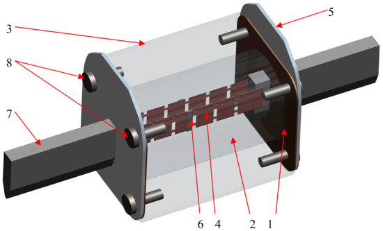 Thermal model of the HBC fuse (1—inner cap; 2—silica sand; 3—ceramic body; 4—fuse link; 5—outer cap; 6—alloy M-effect; 7—knife contact; 8—screws).