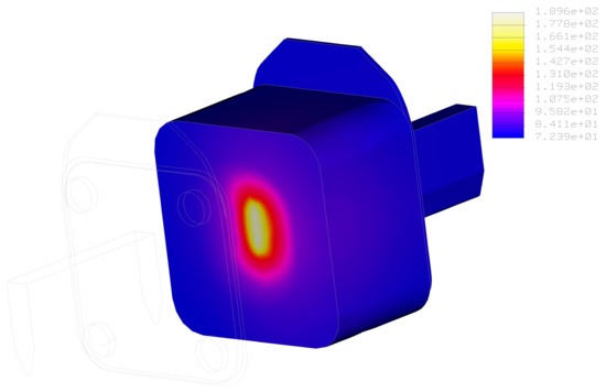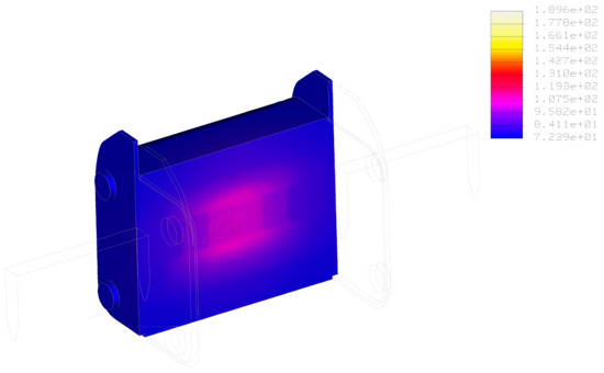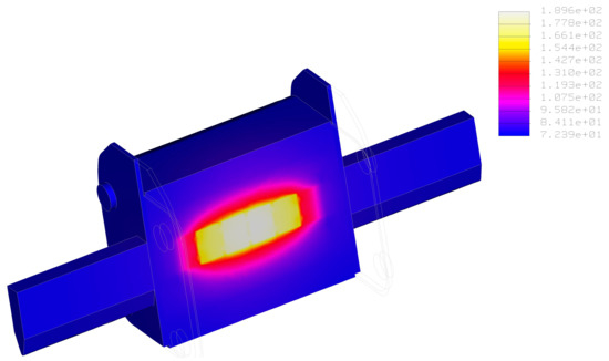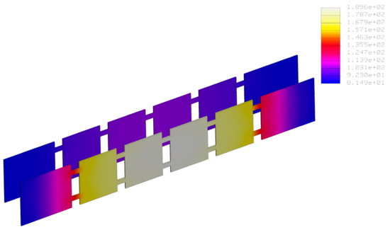 The next thermal analysis was carried out for the variation of the notch cross-section from 0.2 mm2 to 1.6 mm2, Figure 9. In this case, the constant parameters are the distance between notches, 7 mm, the asymmetrical coefficient α = 0.8 and the electric current with the value of 160 A. The variation of the notch cross-section means the variation of the additional power loss which leads to variation of the maximum temperature rise of the fuselink. It can be noticed, Figure 9, a decreasing of the maximum temperature rise for both fuselinks when the notch cross-section increases. The explanation is that additional power loss depends inversely proportional by the notch cross-section, and finally, the maximum temperature rise of the fuselink has the same variation. The maximum temperature rise of the most leaded fuselink, decreases from ϑmax1calc = 201.1 °C to 95 °C and the maximum temperature rise of the least loaded fuselink, decreases from ϑmax2calc = 106.7 °C to 54.3 °C when the notch cross-section goes from 0.2 to 1.6 mm2.