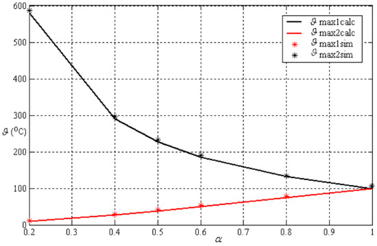 Maximum temperature rise variation at different assymetrical coefficient values. Comparison between computed (ϑmax1calc, ϑmax2calc) and simulated values (ϑmax1sim, ϑmax2sim).