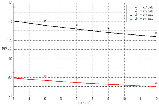Maximum temperature rise variation for various distances between notches. Comparison between computed (ϑmax1calc, ϑmax2calc) and simulated values (ϑmax1sim, ϑmax2sim).