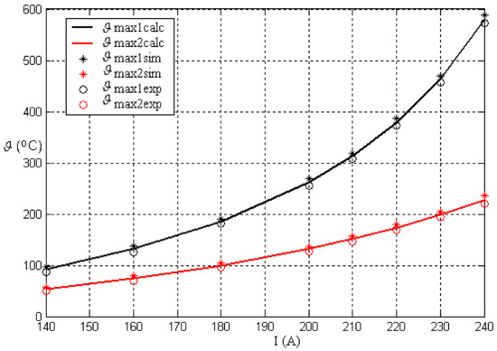 Maximum temperature rise variation at different current values. Comparison between computed (ϑmax1calc, ϑmax2calc), simulated (ϑmax1sim, ϑmax2sim) and experimental results (ϑmax1exp, ϑmax2exp).