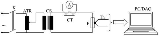 To validate the results obtained for the maximum temperature rise, experimental tests have been made. In Figure 12 the electric circuit diagram used for experimental tests is presented.