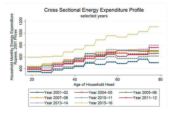 Figure 3 shows household energy expenditure for all of the selected survey years with respect to household head’s age.