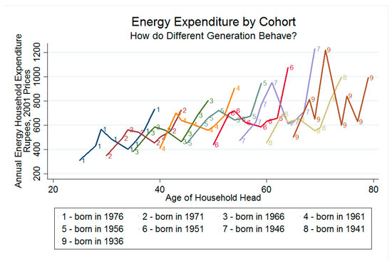 3]. This conclusion is related to the observation that increasing energy demands for heating and cooling is interlinked with less active or inactive lifestyles of elderly populations. However, this scenario is more complicated than expected, as it involves numerous factors, including consumer preferences, trends in aggregate income, and societal transformation. Several contradictory effects may arise through the interplay of such factors. This paper puts aside these counteracting forces and their macroeconomic aggregate results and it focuses on the microeconomic perspective of energy demand by exploring household heterogeneity in terms of age and generation. In order to analyze the impacts of the age and generational specific effects on the structure of energy consumption, the cohort analysis is considered to be an appropriate tool because it facilitate and allows for the separation of the age (A), the period (P), and the cohort (C) effects. The age effect depicts the impact of the age category on energy consumption. Period effects characterize the impact of macro-economic and historical events on energy consumption, e.g., business fluctuations or epidemics (Deaton, 1997), whereas the cohort effect helps to determine generational differences in energy demand.