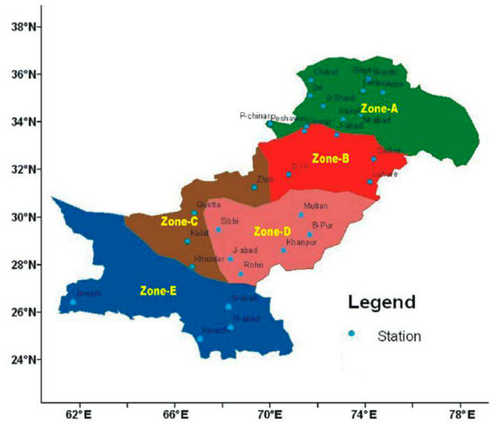The climate varies vastly throughout the year in most regions of Pakistan. So, it is impractical to consider the whole country under one climatic zone because different stations have different topography and complex microclimates. Based on geographical features, the Pakistan Metrology Department has divided the administrative districts into five different zones, as shown in