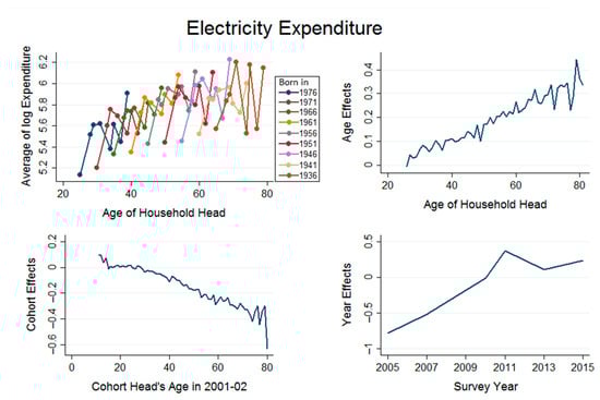We conclude our key findings, as, (1) households’ per capita monthly energy expenditure increases almost steadily with the increase in household head’s age, (2) estimated values of age effects show increasing trend with age, (3) estimated values of cohort effects show decreasing trend with age, which implies that newer generations are more prone to the use in their daily lives high energy consumption modern equipment and products, and (4) year effect for electricity expenditure exhibits an increasing trend and shows peak at year 2010–2011, due to the increased prices of electricity.