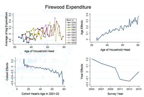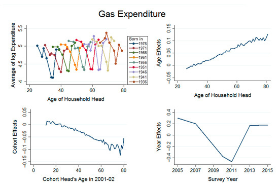 10]. The results also provide strong empirical evidence of significant differences in the shape of cohort and age effects. The pure age effect could also be entangled with various cultural factors that may differ across generations. Resemblance in cultural influences and social experiences shape the patterns of energy consumption through generations. Thus, the differences in electricity expenditures across generations are greater than those in gas, and are smaller than those in firewood expenditures.