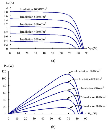 A family of (a) I-V; (b) P-V characteristic curves with the irradiation level as a free parameter for a 4-series 1-parallel array built with SANYO HIP-2717 PV modules at a module surface temperature of 25 °C.