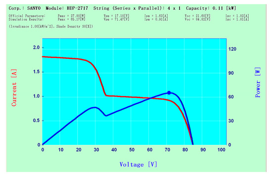 There is an obvious difference between the I-V as well as P-V characteristic curves of a PV module array in normal and abnormal operations. Presented in Figure 1 is a family of I-V and P-V characteristic curves of a 4-series 1-parallel array built with SANYO HIP-2717 PV modules [12] (Panasonic Co. Ltd., Kusatsu, Japan) at an irradiation between 200 and 1000 W/m2 and a surface temperature of 25 °C. As exhibited in Figure 2, multiple peaks appear on the I-V and P-V characteristic curves in the event of a single shaded PV module. In simple terms, a multiple peak problem is inevitably seen on both the P-V and I-V characteristic curves in a cascade array configuration under partially shaded conditions.