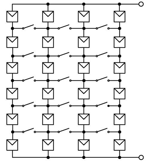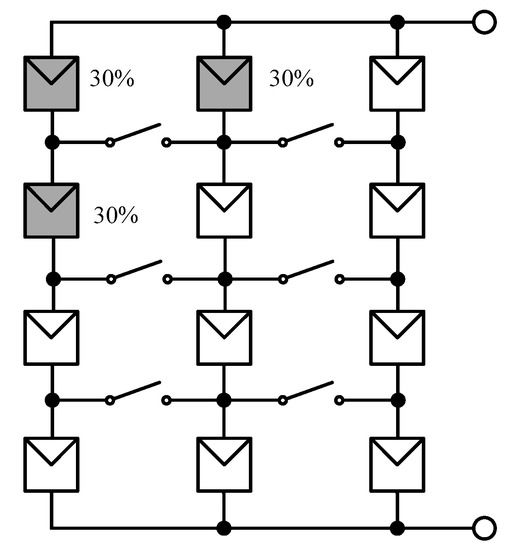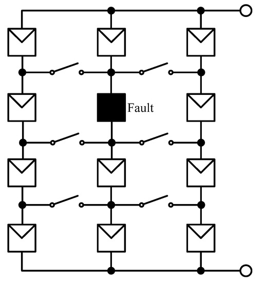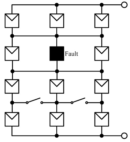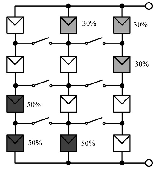 A partially shaded or malfunctioning PV module(s) in an array leads to multiple peaks on the corresponding P-V characteristic curve, and gives rise to a considerable output power drop [1,2]. In light of this, global maximum power point tracking algorithms [3,4,5] are proposed to resolve such multiple peak problems and as a way to reduce the shadow or malfunction impact on the overall system performance. Since a PV module array is operated in a fixed configuration, the above-stated algorithms lead to limited improvement in the electricity generation efficiency, particularly under serious shaded or malfunctioning conditions.