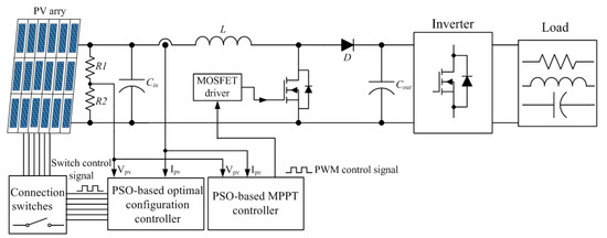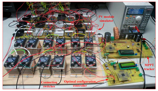 As presented in Figure 4, the proposed global MPP tracking system for a photovoltaic module array mainly involves three subsystems, namely: (1) a boost converter; (2) an MPP tracker; and (3) an array configuration controller. Skillful manipulation of the boost converter is made using the MPP tracker, such that the operating point of the photovoltaic module array stays constantly at the MPP. In normal operations, all the switch conduction statuses remain unchanged, and the array configuration controller remains disabled until there is any shadow, or malfunctioning, event. In contrast, the moment there is any shadow event or module failure detected, the array configuration controller operates in such a way that the output power is maximized through switch controlled reconfiguration.