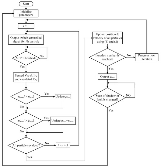 As illustrated in Figure 3, there is a single switch between neighboring PV modules deployed along adjacent branches. This presented smart algorithm is demonstrated through a skillful manipulation of switch conduction. Accordingly, the module configuration is optimized in any case whenever there is a shadow or/and malfunction event in a PV module(s), such that the PV module array operates constantly at the global MPP as intended. This novel algorithm is development based on a PSO algorithm, which will be detailed in the following section.