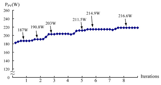 The three test cases investigated in the present study underwent MPPT for 8 iterations under the proposed PSO-based global MPP tracker. According to the average tracking time and MPP tabulated in Table 6, the method accurately identified the real MPP.