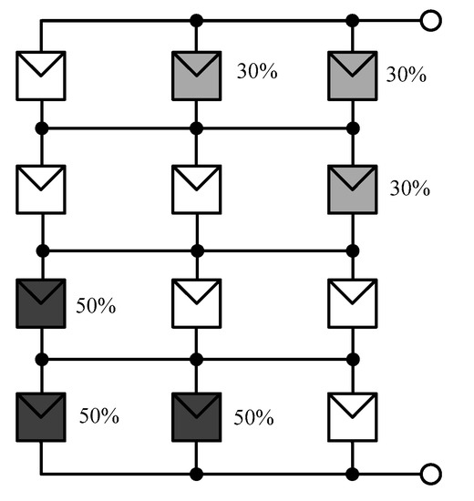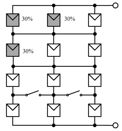 - Wang, Y.J.; Hsu, P.C. An Investigation on Partial Shading of PV Modules with Different Connection Configurations of PV Cells. Energy 2011, 36, 3069–3078. [Google Scholar] [CrossRef]
