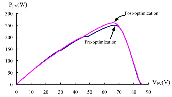 As presented in Figure 11, there are three 30% shaded PV modules at the upper left corner in test Case 2, and the output power is plotted against the number of iterations in Figure 12. The comparison of P-V characteristic curves between the pre- and the post-optimization cases is exhibited in Figure 13, and the optimized PV module configuration is demonstrated in Figure 14. It is found in Figure 12 that the configuration is successfully optimized following 7 iterations. Table 4 gives a 3.22% rise (8.06 W) in the output power after optimization.