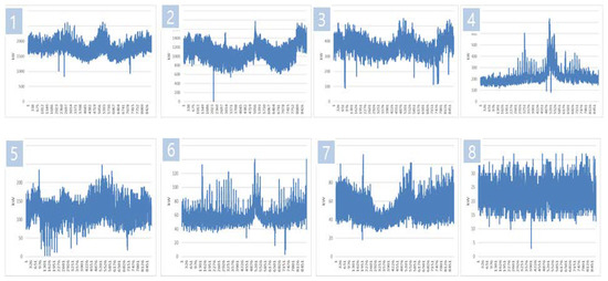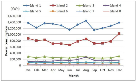 Figure 1. As each island has an independent power source involving only diesel generators, it is assumed that the power generated per hour is the power consumed each hour. In the eight islands, except for Islands 4 and 6, the annual power usage is relatively stable, and the power peak is not remarkable. On the other hand, power consumption for Islands 4 and 6 is concentrated at a specific time or a power peak is much larger than the average power consumption. Unevenness of power consumption and power peak in the period is the main cause limiting the expansion of renewable energy resources.