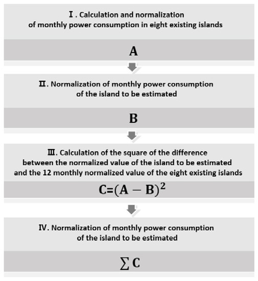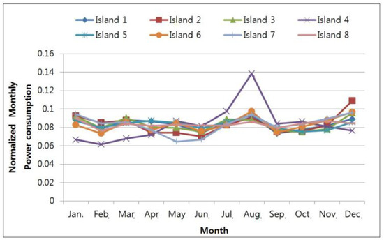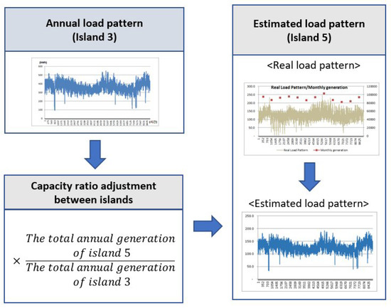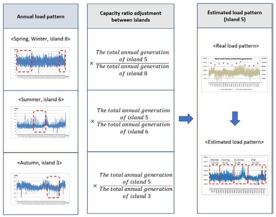As stated above, to design a microgrid based on the limited data of power load, this paper proposes a new method to estimate the load pattern using existing load pattern data to improve reliability. The basic assumption of the estimation method of the load pattern is that if the generation pattern is similar, such as monthly or seasonal, then the hourly load pattern will also be similar. The background for this assumption is that most islands in Korea, except in special cases such as Jeju Island (tourism) and Geoje Island (shipbuilding), are highly likely to have similar patterns of lifestyle, such as fishing or a combination of agriculture and fishing, so there will be similarities in monthly or seasonal power usage patterns depending on the crops or fishing species, and there should be similarity in hourly load patterns. In this study, the most realistic estimation method is found by comparing the homogeneity of the pattern of annual (every month), seasonal, bi-monthly, and average monthly generation.
