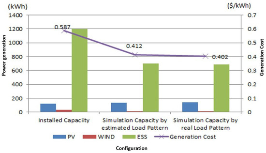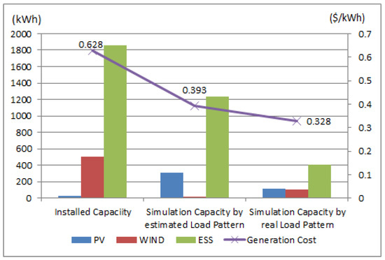 With the application of the load pattern calculated using the four load pattern estimation methods for the eight islands, a microgrid power system that achieves the lowest generation unit price while satisfying the renewable energy ratio ranging from 10% to 90% (changing by policy) with 10% gaps has been designed. The estimation method of the load pattern with the most similar facility configurations using the method of least squares through the differences in capacity of each facility according to the actual load patterns is shown in