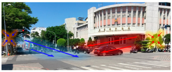 In Taiwan, cameras are very common at crossroads, streets, corners, and underpasses for the purposes of monitoring potential criminal activity, gathering data on the environment, and collecting information regarding traffic. Figure 1 shows an example of an intersection with a set of cameras in Taitung City. Four cameras are deployed at the eastern intersection, which is marked in red, while another four are set up in the west. These devices gradually may be upgraded to object tracking systems, in order to track car accidents, potentially record information from terrorist attacks, and help city security. For the foreseeable future, an increasing number of object tracking devices will continually be implemented and deployed to surveil traffic, and work towards the prevention of damage within the city.