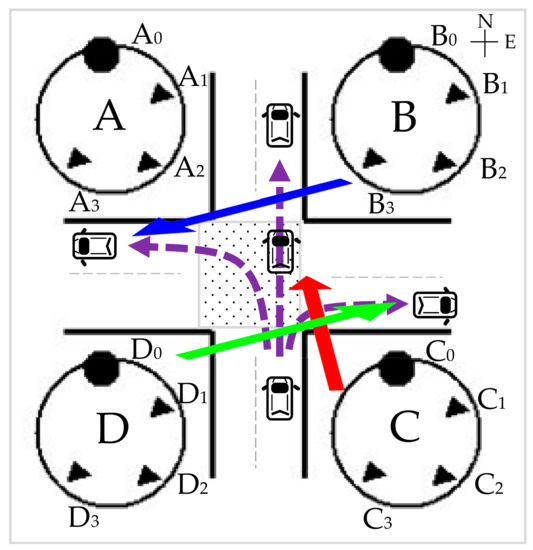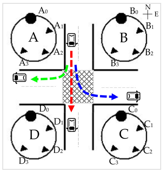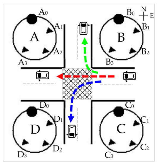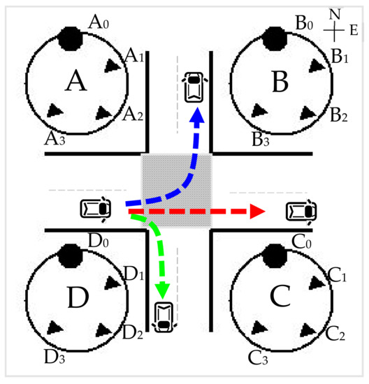 First, we analyze one object approaching from the south in Figure 2. There are three possible paths: Turning left and then proceeding west, in which case dynamic energy is consumed in cluster B while the object completes the left turn while clusters A, C, and D consume static energy; proceeding straight, causing dynamic energy consumption in cluster C, but static energy consumption in clusters A, B, and D; or the object could turn right, leading to dynamic energy consumption in cluster D, but static energy is used in cluster A–C. Table 1 summaries the energy consumption patterns for the various clusters for the three paths.