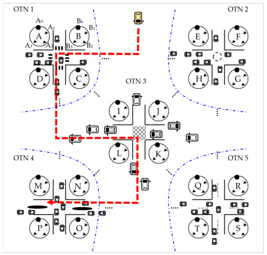 The target being tracked approaches from the north and travels along the red dotted line in Figure 6. It sequentially passes by OTN 1, 3, then 4. Therefore, clusters A, B, C, and D in OTN 1 will be activated when the tracked target arrives in their surveillance area. According to the direction of the target, cluster B is activated first at time 0 (t0), and all cluster B object tracking devices, B0–B3, consume dynamic energy. Clusters A, C, and D in OTN 1, and all clusters in OTN 2–5, are in standby mode—resulting in static energy consumption. Second, the target arrives in cluster A’s area, where the set of object tracking devices are named A0, A1, A2, and A3. The four devices execute the object tracking job, resulting in dynamic energy consumption. Conversely, clusters B–T consume static energy. Both dynamic and static energy consumption are recorded at time 1 (t1). Third, the target object leaves the OTN 1 area and goes to the OTN 3 region. Time 2 is designated t2. Dynamic energy consumption occurs in cluster L. Consequently, the object tracking devices, L0, L1, L2, and L3 consume dynamic energy. In contrast, the rest of the clusters consume static energy. Fourth, the object turns right from cluster L. The scope of surveillance is in cluster I, whose set of object tracking devices are designated I0, I1, I2, and I3, which are, enabled to track the target, resulting in their dynamic energy consumption at time 3 (i.e., t3). All clusters, excluding cluster I, consume static energy. Finally, the target turns right and then arrives at the intersection of OTN 4. Cluster N enters into service at time 4, also named t4. Dynamic energy consumption occurs in object tracking devices N0, N1, N2, and N3, while the other clusters consume static energy.